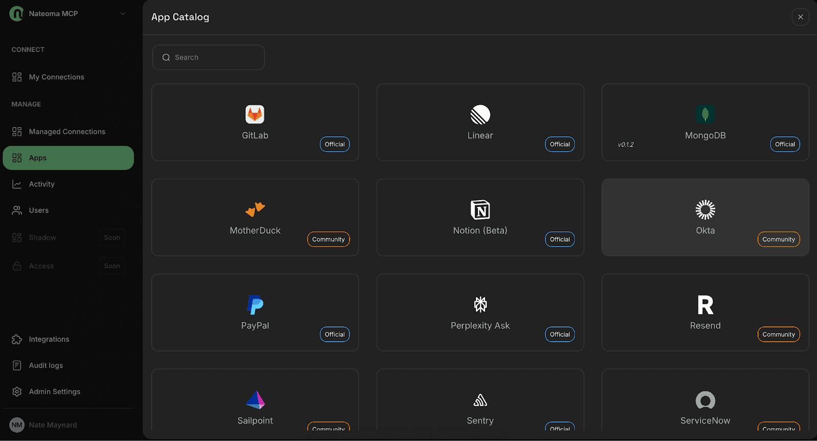 With your Okta connection established in Natoma, you can now integrate it with Claude Desktop using the Model Context Protocol (MCP). Navigate to the My Connections screen and hit the + button next to the available connections to add one for yourself.
