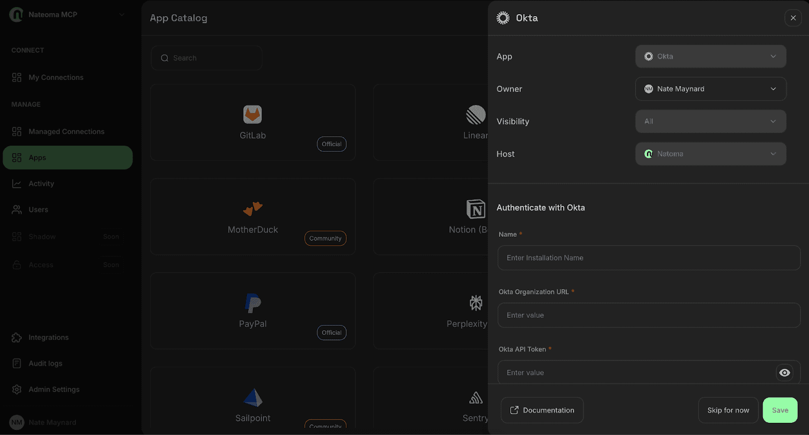 All of this happens securely through Natoma's managed connection system, giving you the power of Okta's API with natural language interfaces.