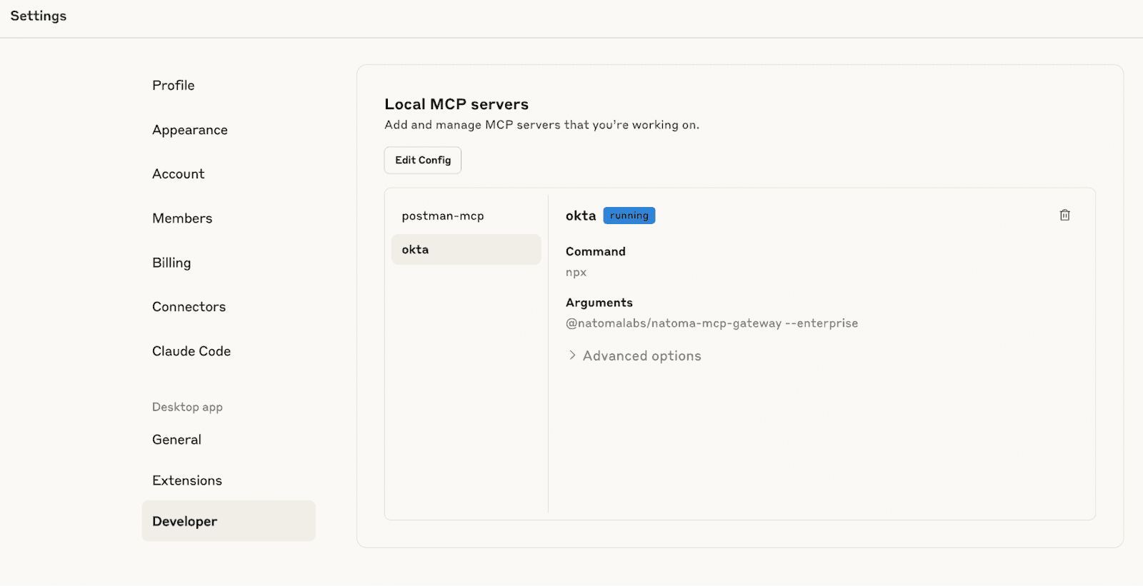 To confirm everything is working correctly, check Claude's settings under your chat interface. You should see the MCP server listed as connected, indicating that the Okta integration is active and ready for use.