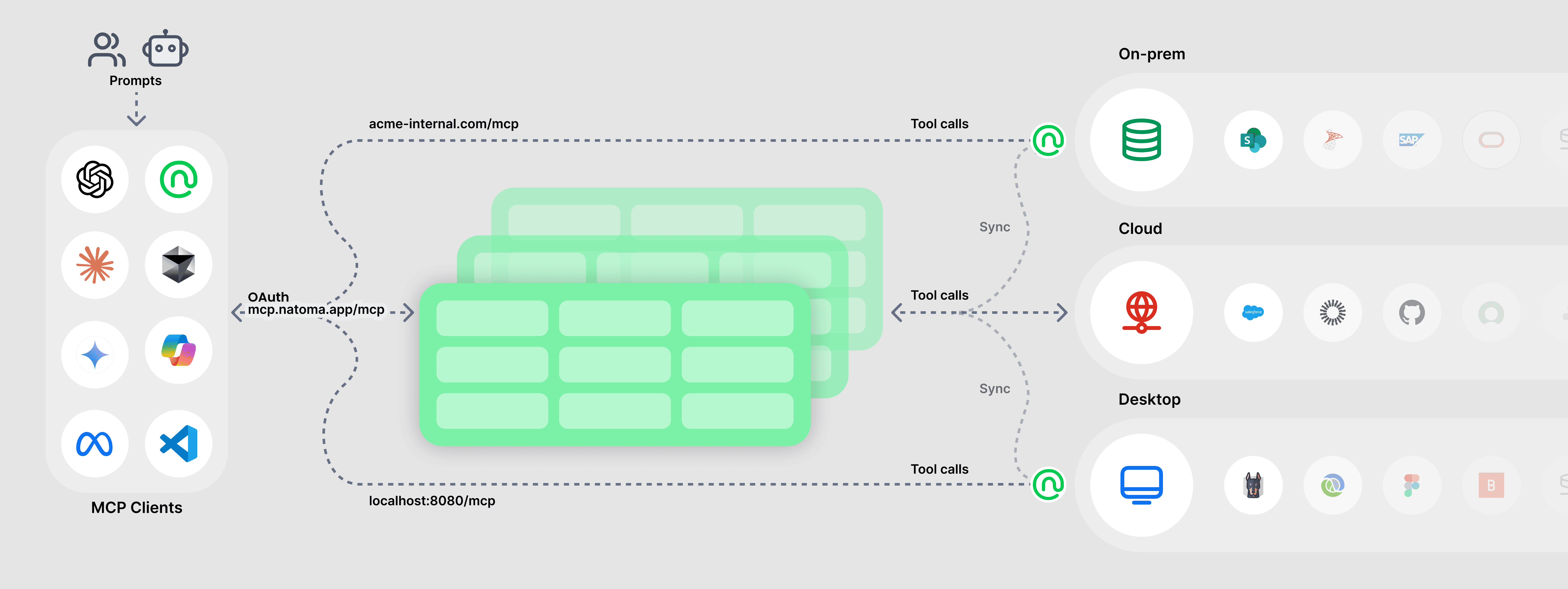 Natoma's MCP Hub serves as the orchestration layer between AI agents and enterprise systems: